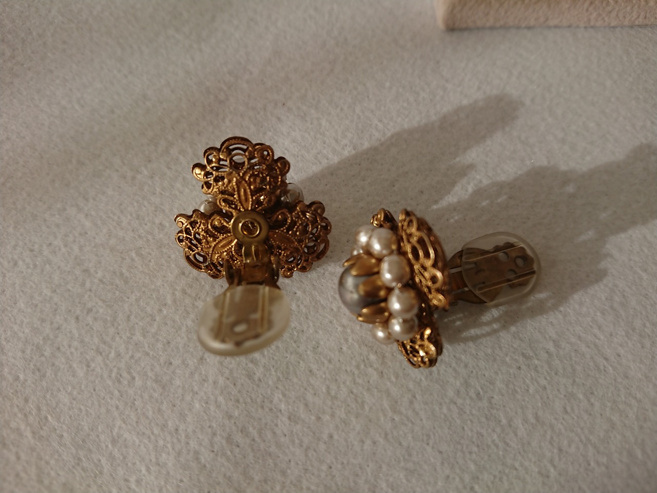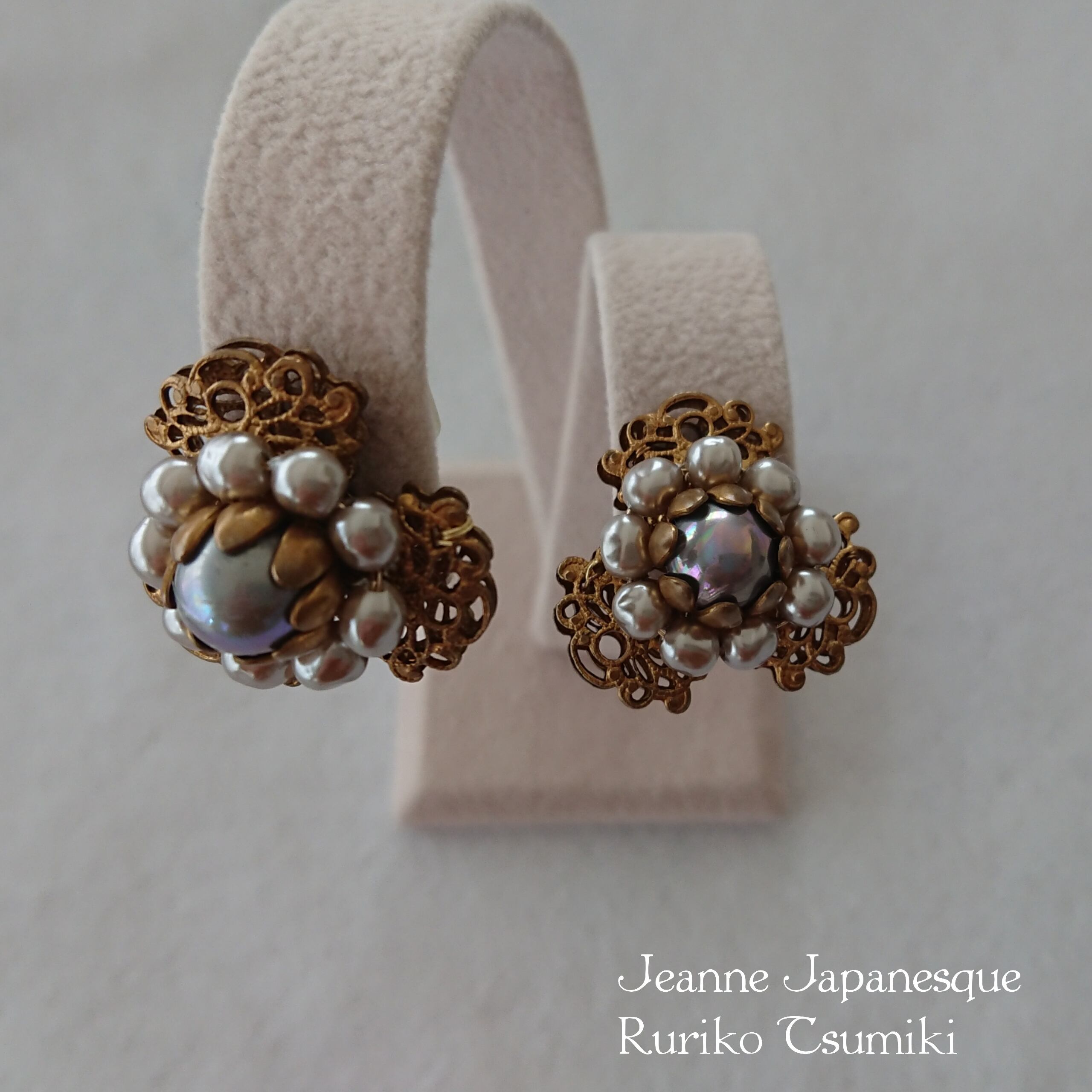 中心にヴィンテージパールでも珍しい光沢のパールを使っています。ハスケルの美しい真鍮のフィリグリーをイヤリング金具にして裏からも美しさもテンションが上がります。