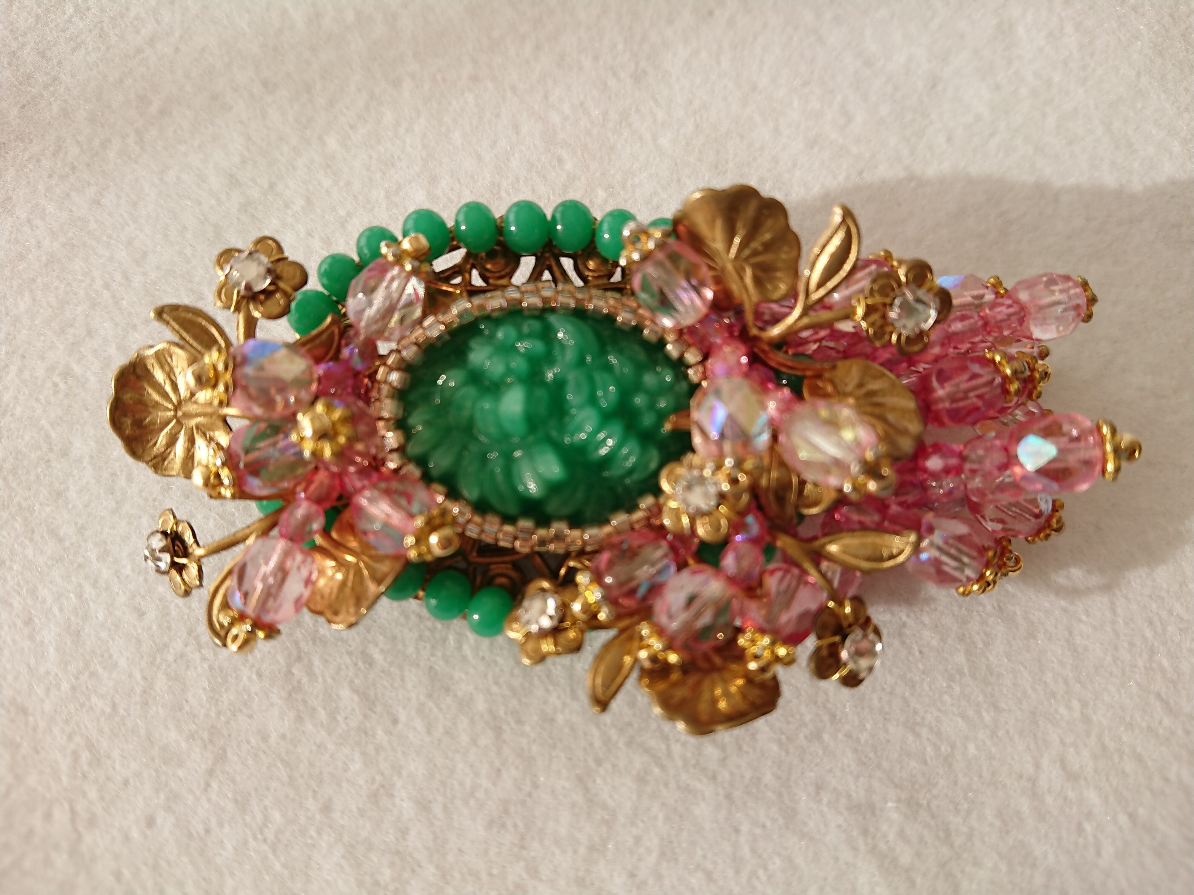 翡翠色と細工がなんとも高貴なガラスカボション(ヴィンテージ)の池から溢れそうに茎を伸ばして盛り上がって咲く蓮のイメージです。蓮池からはモネの睡蓮や芥川龍之介の「蜘蛛の糸」を連想。