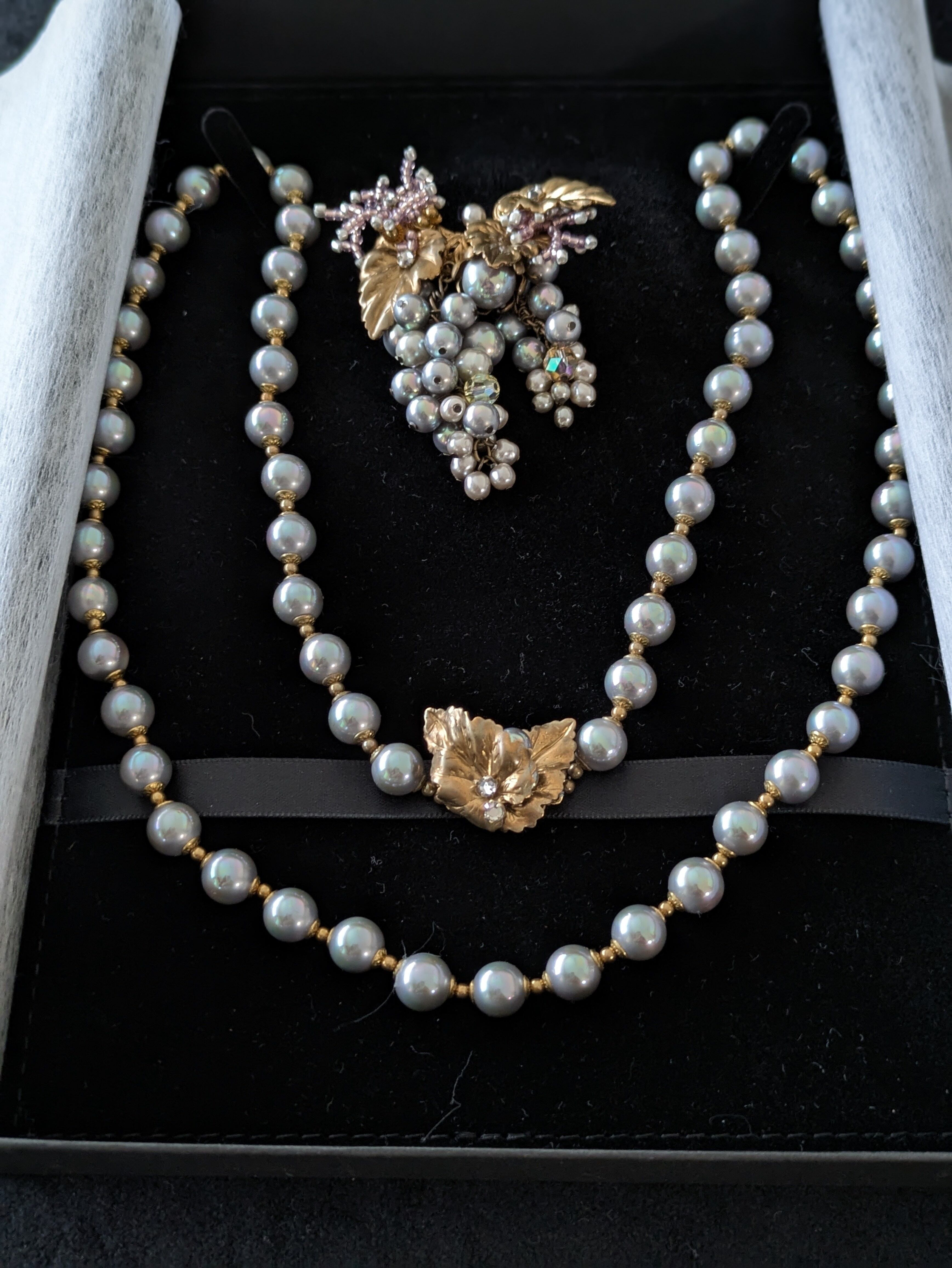 長めなので、被って装着もできて、とても楽に格上げ変身できます。ぜひ、同じパールを使ったブドウのイヤリング、ブローチも御覧下さいませ。こちらは、セット使いが本当に素敵です。