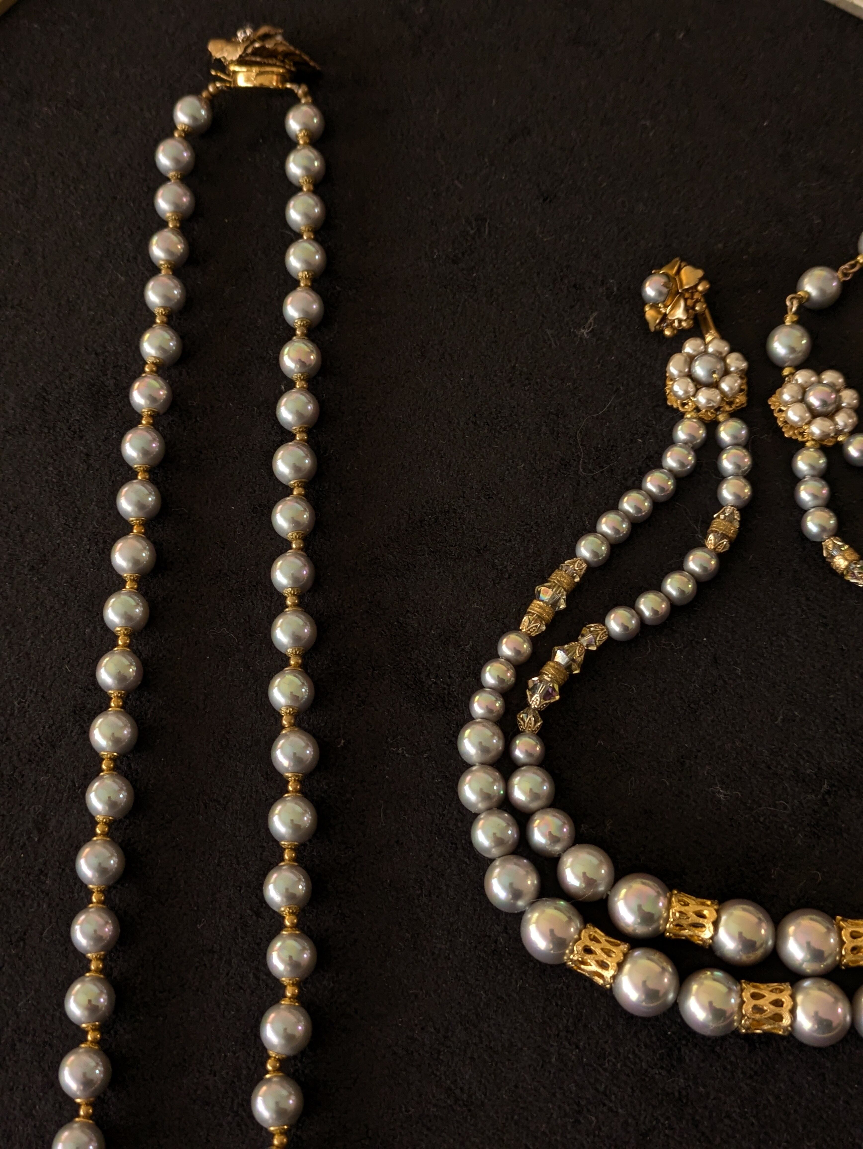 ジャパンヴィンテージガラス磨きパール。シルバーにしゃぼんの様な光沢のある珍しいパールを見つけ入手。地味派手で割と人の目に着きます。