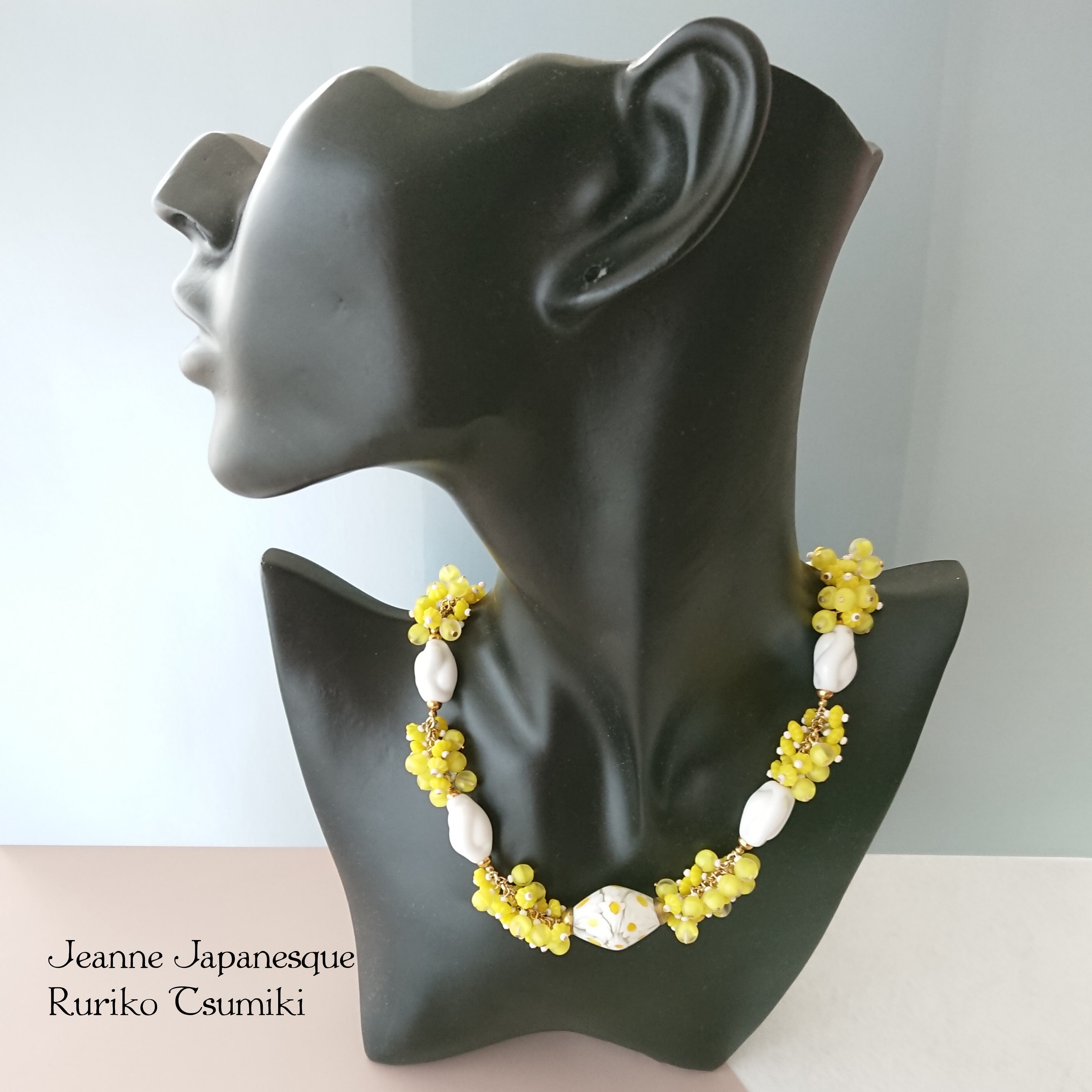 中央にマーガレットの模様の入ったベネチアンガラスビーズをおき、白、黄、金の爽やかでエレガントなネックレスをお作りしました。