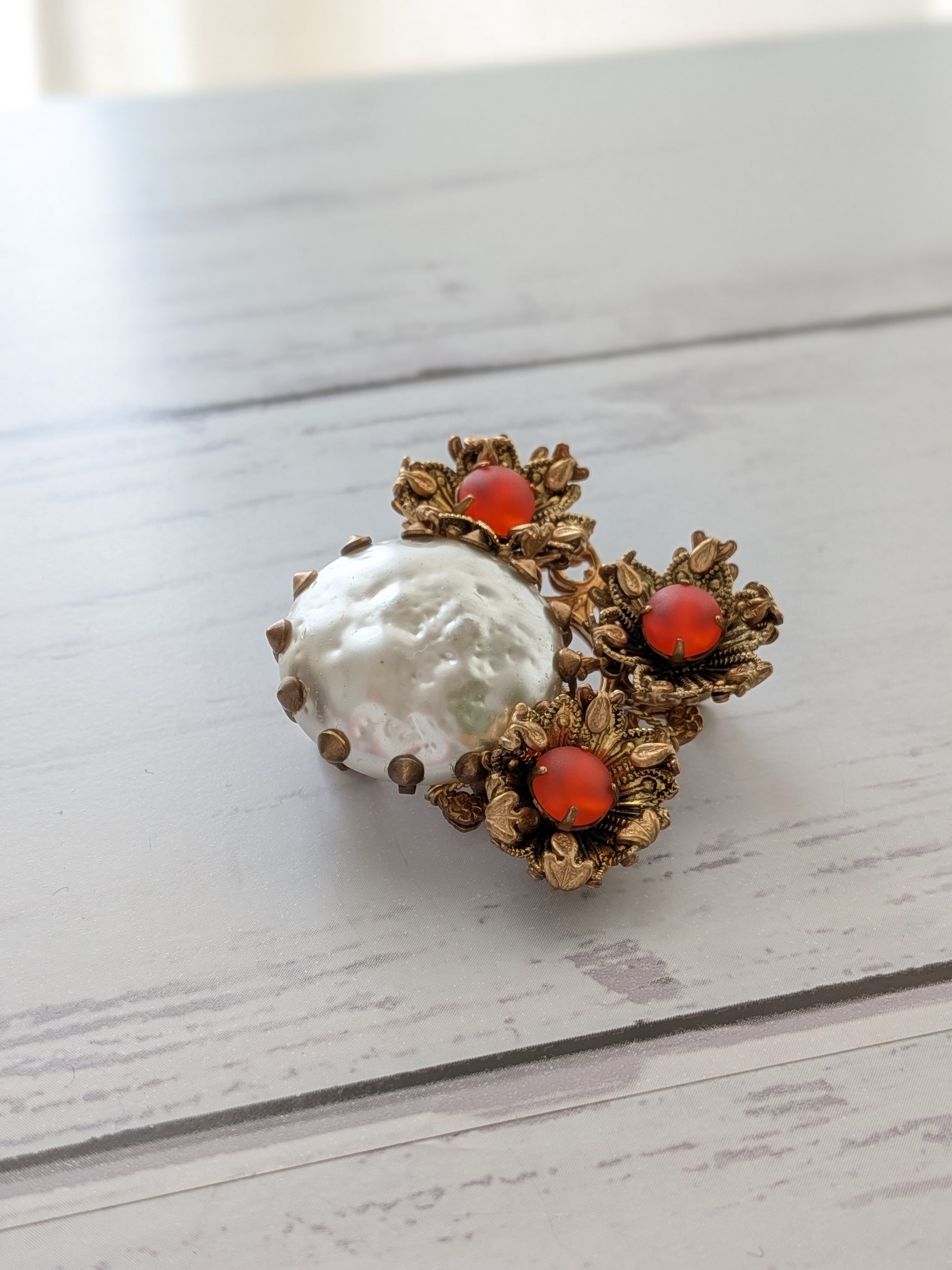 RT-131 情熱の灯オレンジとバロックパールのブローチ